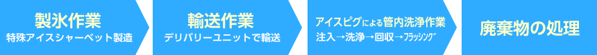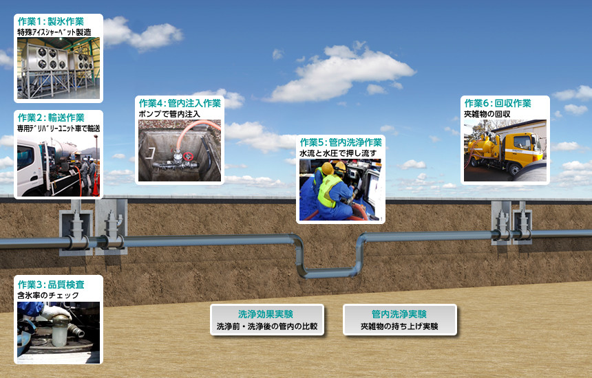 特殊アイスシャーベットは氷(固形物)の割合が多いので、管内面の汚れを擦り取る能力に優れ、また管内に堆積する砂や石などの夾雑物をシャーベット内に包み込んで運び、管外に排出することができます。